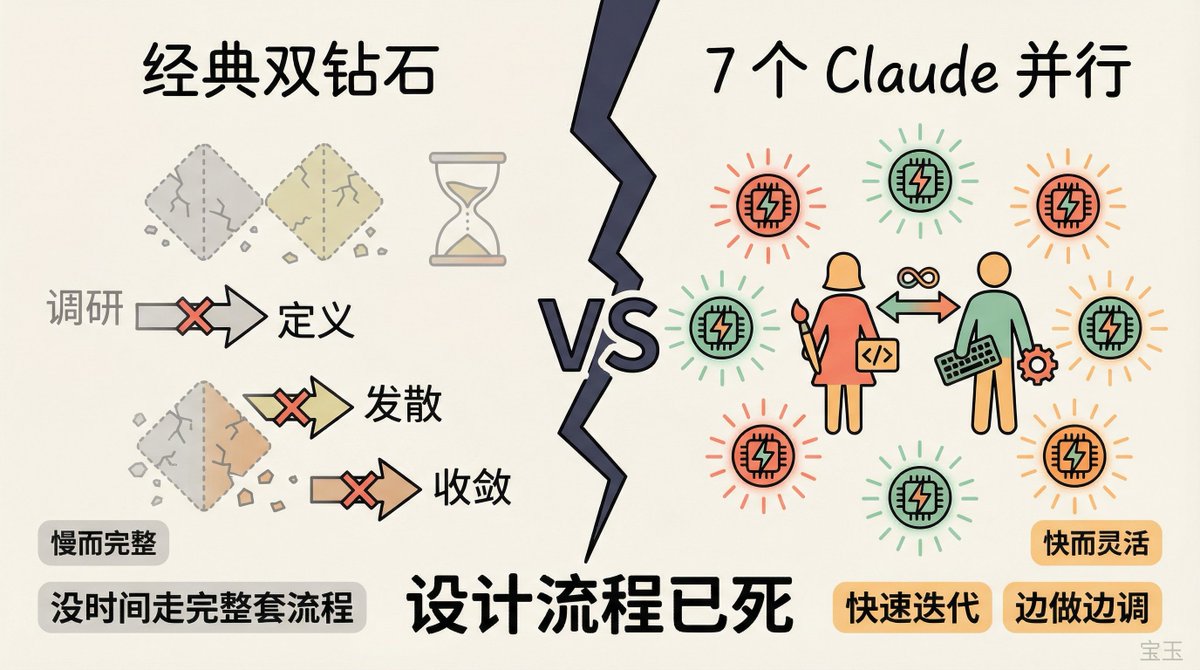 这套方法论在 AI 之前就已经有点撑不住了,但当工程师可以同时开 7 个 Claude 实例去造功能时,设计师就彻底没法用老流程来工作了。
